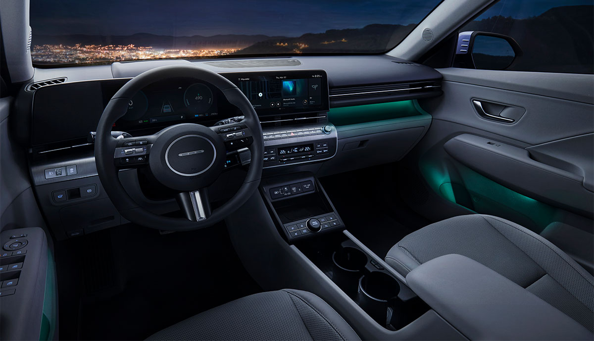 Im Innenraum bietet der KONA Electric ein modernes Cockpit mit digitalen Anzeigen, hochwertigen Materialien und einem klar strukturierten Bedienkonzept. Dank des flachen Bodens und der durchdachten Raumaufteilung profitieren Fahrer und Passagiere von einem angenehmen Platzangebot und hoher Alltagstauglichkeit.